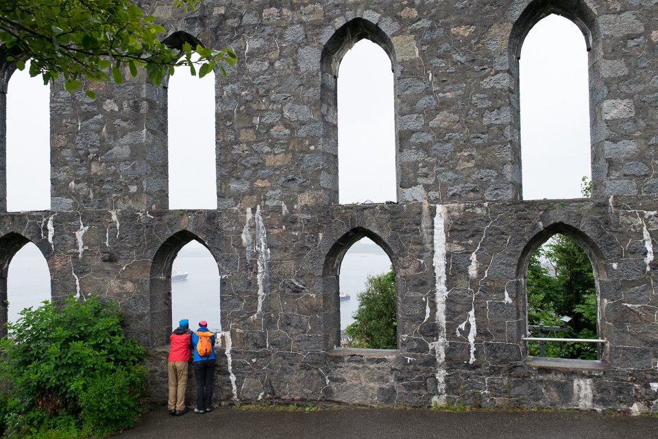 After a wee dram, we continued enjoying the rainy afternoon by taking a photo walk with or climbing the hillside to visit McCaig’s Tower, a stone structure reminiscent of the Roman Colliseum which was constructed by a local investment banker in part to keep stonemasons employed in 1890. Today this “folly” is home to a park filled with beautiful greenery, such as the prehistoric looking gunnera plant, and offering outstanding views over Oban and out to the isles of Kerrera and Mull (when the rainclouds would obligingly part).
