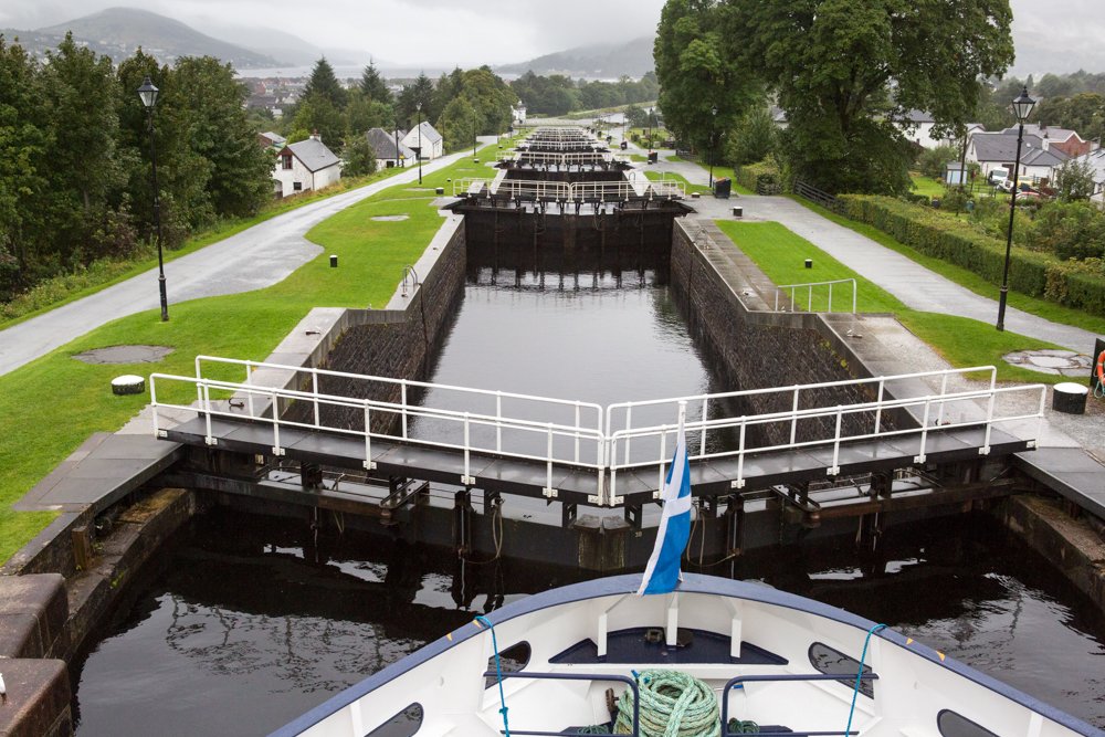 Thick cloud and mist concealed Ben Nevis, Britain’s highest mountain, immediately to the ship as we slipped our moorings at Banavie to begin the decent of Neptune’s Staircase. This flight of eight locks lowers vessels 64 feet for the final section of the Caledonian Canal that leads to the sea-lock at Corpach. Between Banavie and Corpach we also negotiate a road and railway bridge, so the first few hours of sailing were eventful. At Corpach, the Canadian flag flies alongside the Scottish saltire, a celebration of the links between the Caledonian Canal and the Rideau Canal in Ottawa.