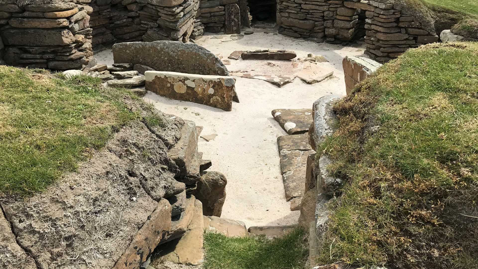 The neolithic heart of Orkney, UNESCO World Heritage inscribed, abounds in monumental archaeological sites. Skara Brae is a remarkably intact village that was exposed by a storm in 1850. Its stone houses survive, complete with stone furniture, including beds, dressers, and hearths. These houses were inhabited by Stone Age farming people for 600 years between 3100 BC and 2500 BC. The contemporary Ring of Brodgar originally comprised 60 standing stones in a wide circle within a henge defined by a deep rock-cut ditch, part of a complex of monuments that dominate the landscape in this part of Orkney.
