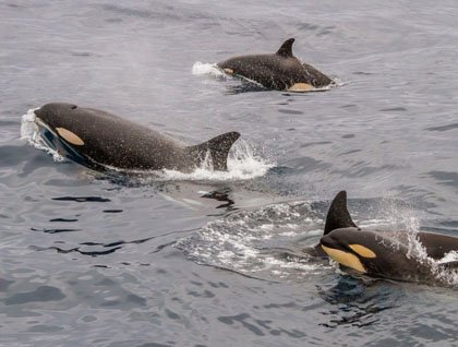 At the stern a mother brought her young calf to investigate the turbulence of our prop wash. Along the port side an adult female was inverted and lobbing her tail repeatedly while swimming straight toward the ship. Off the bow, curious killer whales slowly paced the ship, surfacing to get a clear glimpse of us.