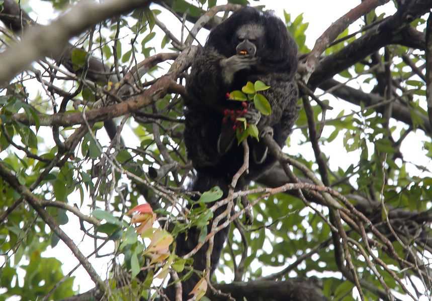 We entered Pahuachiro, where our guides quickly found the first three-toed sloth. In fact, it was a mother and a baby that were taking a nap way up on a leafless tree. After that, we had many sightings of interesting birds like yellow-headed caracaras, cream-colored woodpeckers, long-billed woodcreepers, short-tailed parrots and black-fronted nunbirds, among many others. We also saw a small troop of squirrel monkeys and had a very nice sighting of monk saki monkeys.