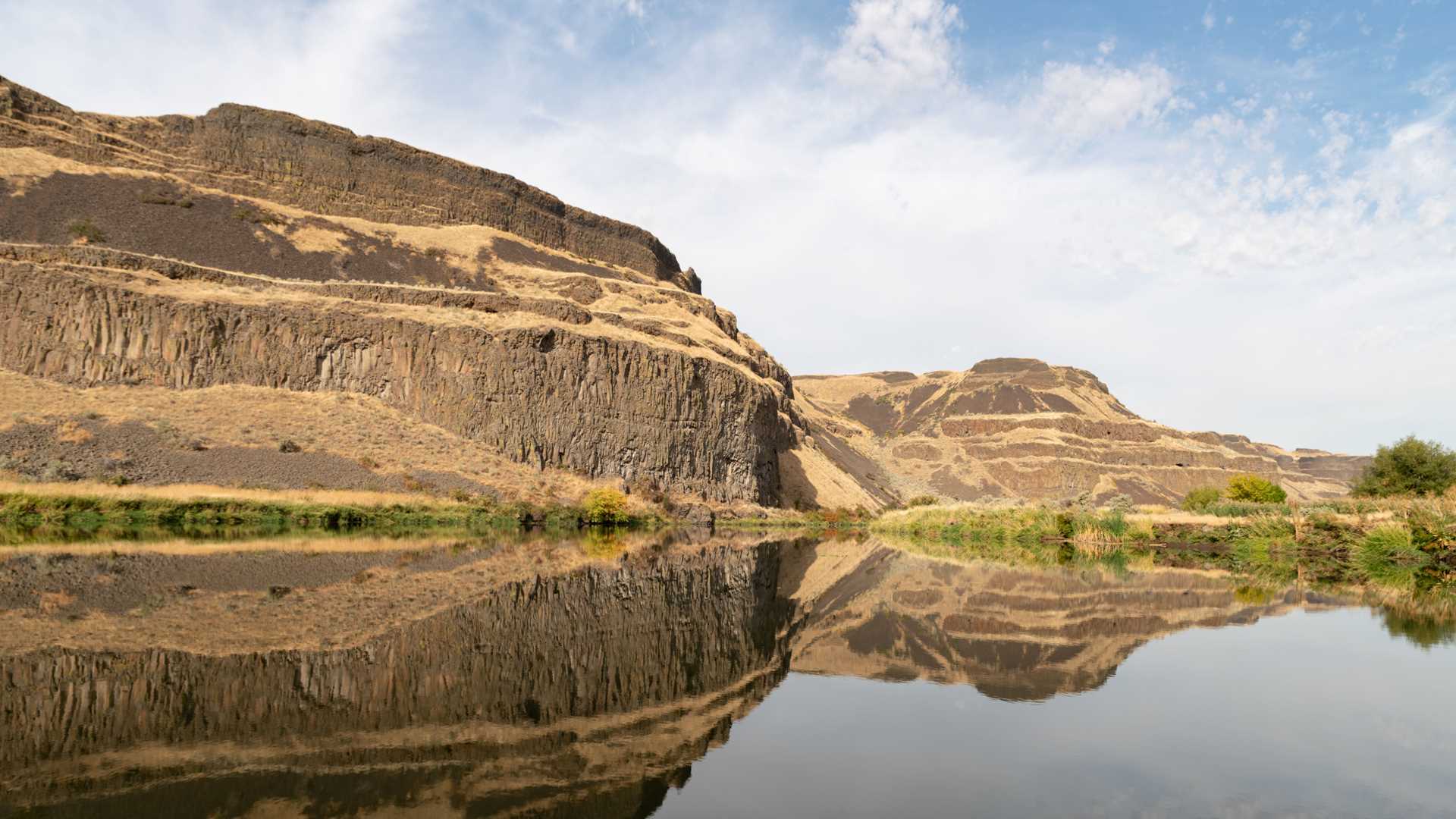 The air is warm and still, the water a perfect mirror, as we emerge from the cattails and turn up the Palouse River. Five miles upstream, Palouse Falls pours two hundred feet from its bed in the sage steppe, through a shallow vee eroded in the basalt escarpment, into a nearly round plunge pool below. From there, the river winds its way, tumbling down shallow cascades through an ever-widening canyon until it is finally stagnated into the mirrored surface we are slowly motoring through.