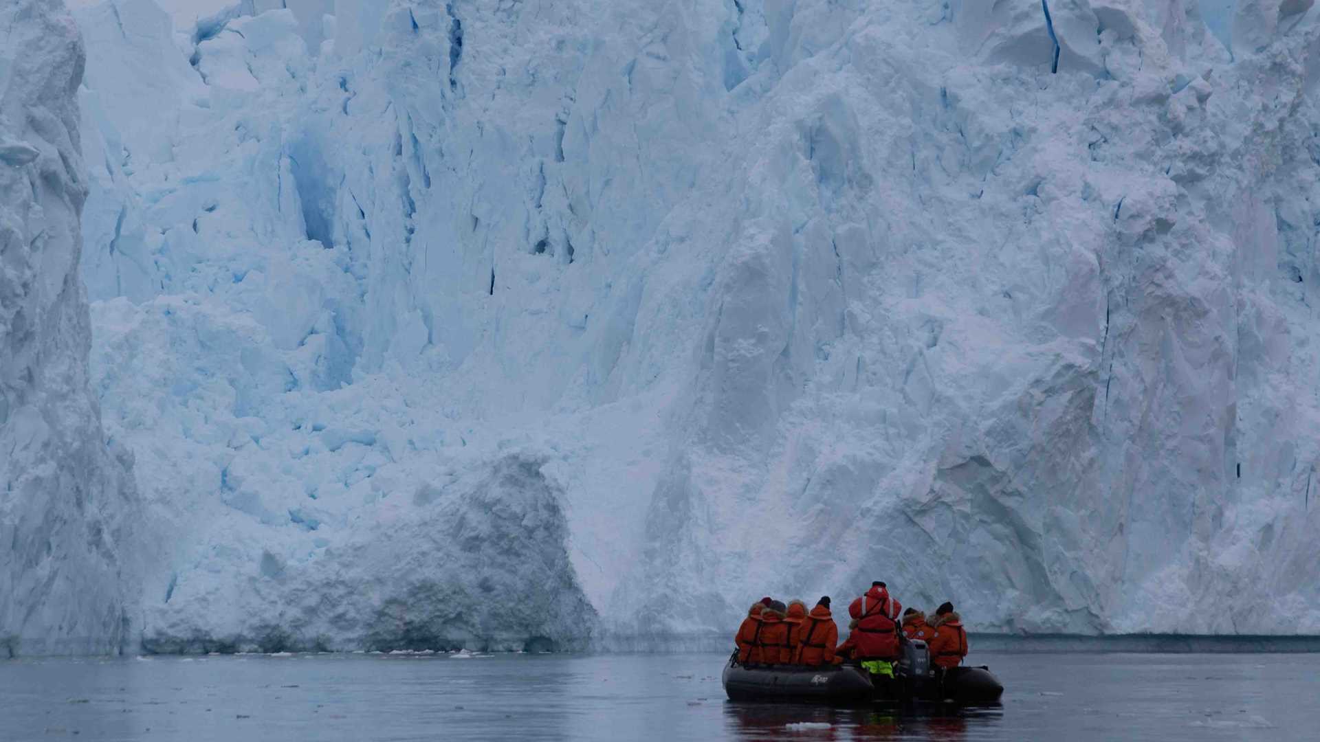 While this first group of folks were on land, the remaining group went around the bay on Zodiacs. Glacier faces and cloud-shrouded peaks set the backdrop of this black-and-white landscape. A few smallish icebergs floated in the bay. A leopard seal occupied one as a comfortable sleeping platform and it was likely soundly dreaming of krill and penguin meals. Along the edge of another iceberg, a crabeater seal swam around looking for a spot to launch itself out of the water to its resting site.