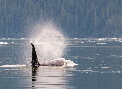 After a steamy frothy espresso and some toe-touching with our wellness specialist, our blood was flowing properly, and we were ready for another day in the Great Land. Diners were joined for breakfast today by a humpback whale cow and calf engaged in restful “logging” activity, setting the stage for a serene morning sail. They turned out to be the first of many majestic M. Novaeangliae we would encounter, most being much more active. We soon found ourselves approaching Morris Reef, and surrounded by not one, but two groups of humpbacks engaged in cooperative bubble-net feeding behavior! We spent time with both pods, viewing and photographing many spectacular lunges, with up to nine of these leviathans’ gaping maws breaking the surface simultaneously and in tightly choreographed formation. Our Global Explorers were then given an opportunity to receive Zodiac driving lessons from our USCG-licensed captains. All souls returned. We continued into the storied seven-mile-long Sitkoh Bay. Here we hiked an old logging road; amongst towering Sitka spruce, frequent bear signs, black-tail deer, and banana slugs galore! Once the wind abated, we also had the opportunity to launch our kayaks and enjoy a leisurely paddle in the bay, with views of National Geographic Venture , bald eagles, and an early 1900s cannery sight. At the end of the day, the ship embraced our return with cocktails, charcuterie, and conversation. A typically highly succulent dinner was followed by a night-capping presentation on birds of the region from our resident ornithologist.