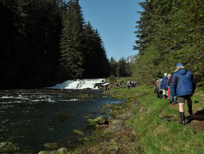 After leaving the intertidal zone behind, we walked along the fringes of ancient forests. Robust Sitka spruce and the more slender Western hemlock rose towering above us as we followed the trails carved from the paws of countless bears. They led us to the cascade of Pavlof Stream as it tumbled down from Pavlof Lake into the bay. The falls were once home to a cannery that took advantage of annual sockeye salmon runs up to the lake. It was amazing to see so little evidence of the people that lived and worked beside the falls. Only a few rusted artifacts remain, scattered amongst the rocks and along the edge of the verdant forest.