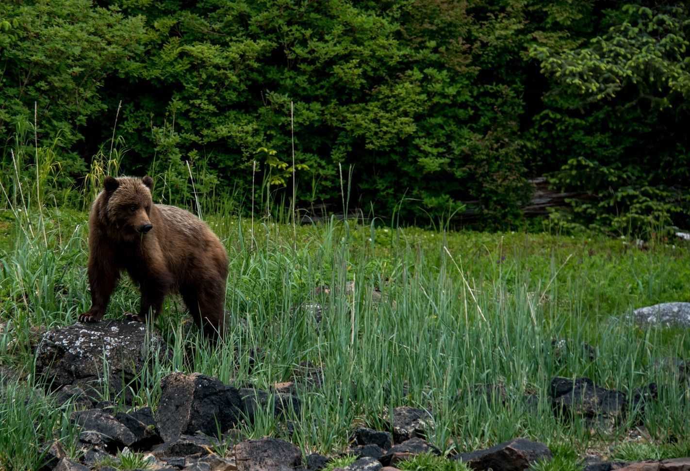 It’s one thing to see bear signs and to follow the traces of where they have been, what they have done. It is another to watch them in action. En route to our landing, two sub-adult brown bears appeared on the opposite shoreline and we watched as they foraged in the grasses. And as a grand finale for the day, we made our way to rejoin the Zodiacs on the beach when a mother bear came into view on the forest edge we had just explored. We watched in awe as she combed the shoreline, followed by her two curious and playful first-year cubs.