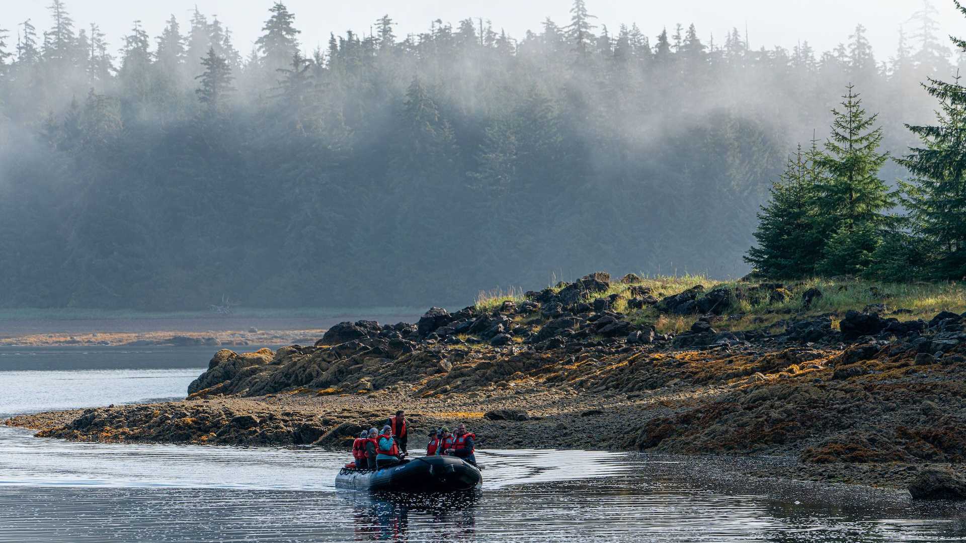 As the ship repositioned to our afternoon anchorage at Iyoukeen, we saw whale blows from the bow. A group of five humpback whales were feeding cooperatively in the exact spot where we were hoping to anchor for the afternoon. We watched this behavior until the whales moved away from the area. After their departure, guests and staff went ashore to hike in the woods and to explore the bay by kayak. Hours later, the whales had returned and were still feeding cooperatively, using bubble nets to trap herring. We watched as they lunged repeatedly in the golden late afternoon light.