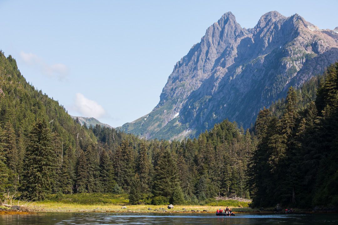 During the morning, we explored the scenic cove of Pavlof’s Harbor on the southeast shore of Freshwater Bay, Chichagof Island, and area known for its healthy salmon stream. We were optimistic that we might still see a bear during our last day exploring Southeast Alaska. We were not disappointed! At the base of a small waterfall, we spotted a coastal brown bear casually gorging itself on salmon as we watched, spellbound, from the safety of our expedition landing crafts only a few yards away.