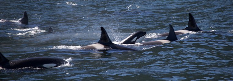 What a morning! What a surprise! Orcas! Even before the morning wake-up call, we encountered orcas. We thought it was a small group, but after a while we noticed a series of killer whales blowing in the distance, then another group and so on… The pod we were watching could easily have been composed of 18 animals, adults and young, and very young. Males and females. We slowly followed them for a while, definitely modifying our early morning plans. Our whale expert, Dr. Andy Szabo informed us about their lives, their behavior and their food tastes. These animals were of the fish-eating groups, the so-called residents. Big pods compose these animals. Their behavior showed us that they were capturing their food, big salmon.