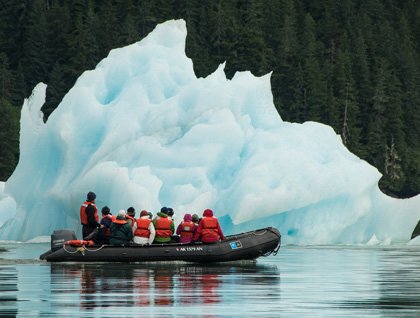 As weather often goes in Alaska, we did not have long before the rain had all but disappeared and sun once again graced the decks of the National Geographic Sea Lion. It seemed however, that more than sun was shining down on us as we came across two humpback whales feeding in the exceptionally calm waters of Chatham Strait. The whales seemed to care less that we were upon them and frequently swam right below our bow. Time went by fast, and it was not long before we needed to leave in order to reach our destination of Red Bluff Bay before dinner. This too would need to be delayed when the captain learned that a fleet of salmon boats was fishing nearby, and that we could navigate close enough to observe and photograph the fisheries we were hearing about in our talks and on our hikes around Southeast Alaska.
