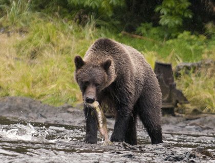 Most of our walks to Pavlof Lake were cut short by a feeding bear. The creek that flows out of the lake tumbles down about a 15-foot-high cascade and then spreads out onto a rocky intertidal area. In the last month of summer, most of the thousands of pink, sockeye, and Coho salmon are able to work their way up through the rocky maze to the lake and beyond. The best time for their journey is near the top of a high tide when they are the least exposed to the sharp claws and lethal teeth of a bruin. As we hiked along the shoreline, we soon encountered a brown bear making abrupt dashes that ended in sudden stops punctuated with flying water and quick movements as slippery salmon barely escaped with their lives. The easiest to catch were those that were slowed from the internal reconstruction of flesh to eggs. Many had just spawned and were struggling to merely stay in the current. Bears can be a fussy bunch, taking only those salmon that provide the highest caloric reward. They rip open the bellies for the eggs of some or bite out the brains of others. It is a raw and essential spectacle to behold. We were in awe, mesmerized by the eating habits of this great beast. The plans for our long, medium, and easier hikes were thrown into disarray. So we just watched, some in expedition landing craft and others in kayaks, while hikers sat on grassy knolls or peered down from elevated places among the spruces.