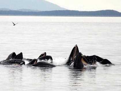 Though many of us could have continued to watch the bear for hours, eventually it was time to continue heading north. However, any disappointment was soon forgotten once we rounded the northeastern tip of Chichagof Island and spotted a group of bubble-netting humpback whales.  Captain Hook and the ‘Chatham Strait black fluke gang’ were there in full force!  We dropped a hydrophone and listened to their loud, trumpet like feeding calls while waiting, transfixed, for the first sign of bubbles at the surface.  And then there it was, a flash of herring, followed by a full lunge with at least a dozen animals breaking the surface in synchrony!  Then, a few minutes later, another lunge!  This carried on for hours - we even broke for dinner, yet watched the animals from the dining room window as we enjoyed our meal!  We continued to watch the animals feed from the bow, nightcap in hand, until the light began to fade.  When we finally retired to our rooms, there was a general sense that this would be a tough day to beat!
