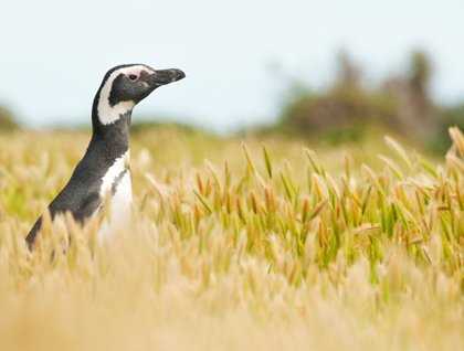 Peninsula Valdes is an anvil shaped extension of the Argentine coastline, 1,200 kilometers south of Buenos Aires via ship. Our morning drive took us east, along the spine of the peninsula until reaching a weathered sign reading: Estancia San Lorenzo. From here we followed dusty roads to lands end and the site of a small Magellanic penguin colony. Inconspicuous from their burrows, these 18-inch-tall, black-and-white seabirds are an unexpected sight when seen waddling through this thorny, flat grassland, many thousands of miles from the ice of Antarctica. Seemingly unfazed by our presence, the designated path took us within feet of some individuals. Many were on eggs, lying in the shade of their burrows while others strutted across the landscape, headed to or from sea: clean and shimmering for the latter, dusty and guano strewn for the former.