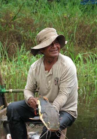 This afternoon we reached our furthest western destination of the trip, the Pacaya River, one of the namesakes of the reserve. Here our goal was a visit to Yanayacu Lake. We had a lovely long skiff ride, further into the reserve than we have yet been. Along the way we made a stop to see a turtle program at one of the ranger stations, and further along, our first red howler monkeys. We also had a chance to visit with some local fishermen who were storing their catch of catfish in a floating net pen. They would eventually take this pen and float downstream for three days to bring their fish to Iquitos to sell.
