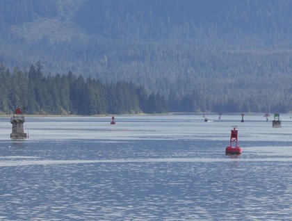 After breakfast, most of us went across the channel in Zodiacs to Kupreanof Island for a delightful walk to visit the muskeg on a boardwalk provided by the Forest Service. Muskeg is the Algonquin Indian name for bogs, a unique and amazing community of plants that can tolerate a water table at the surface and water that is acidic and thus skimpy on nutrients. One of the most interesting plants is the sundew that deals with the low nutrient levels in the muskeg by feeding on unlucky insects that are drawn to its sweet, sticky tentacles. Others of us spent our morning exploring the town or joined our naturalists for a walk on the docks learning about the various kinds of fishing vessels and local fisheries or the amazing invertebrates attached to the docks and pilings. Our ship-home left Petersburg at lunchtime and by mid afternoon we were on our way southward in the narrow, circuitous and beautiful Wrangle Narrows. Mid-way down the Narrows we were in Christmas Tree Alley, a place where the red and green navigation markers and buoys are so numerous and confounding that they look like randomly decorated Christmas lights.