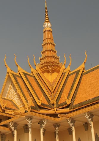 After 20 minutes being chauffeured on a bicycle, we stopped outside the Royal Palace for a guided tour around the magnificent structures, including the highlight—the Silver Pagoda. According to the blue flag, the king was in residence and many were disappointed that he did not come out to have a cup of tea with us.
