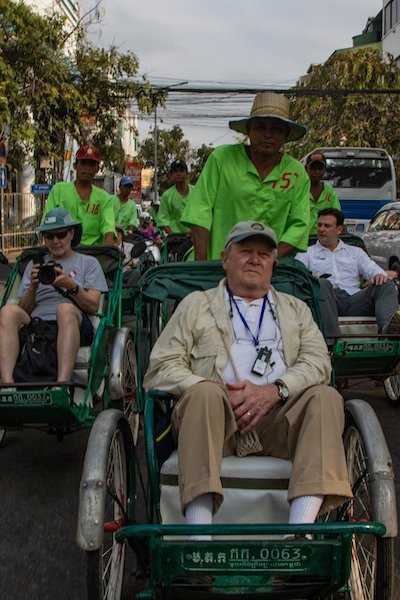 We commenced our day, cruising into the Cambodia’s capital city of Phnom Penh. Nearly 3 million people live in and around this bustling metropolis. After our usual hearty breakfast, we started the day by joining in the seemingly chaotic traffic as passengers on a modified commuting device (not unlike a tricycle) called a cyclo. Being immersed. “in the thick of it” as we were this morning was certainly an experience to remember.