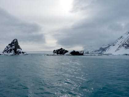 The National Geographic Explorer reached Point Wild, Elephant Island, this morning. As we pulled into our anchorage, the glacier let loose a large mass of ice into the cold sea. Such an event would have struck terror into the hearts of the men late of Endurance. Chinstrap penguins massed on the snow, waiting for it to melt so they can begin their annual breeding. We boarded Zodiacs to view the desolate-looking site from water, cruising where we earlier saw, in Frank Hurley's remarkable photos, the launching and provisioning of the James Caird for the crossing to South Georgia.