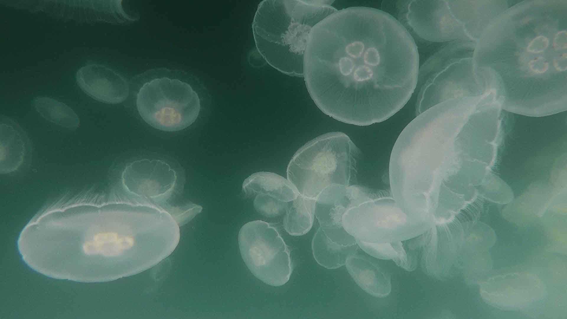 After having our own breakfast, we headed to shore at Pond Island to begin various morning activities, which included bushwhacking, kayaking, and expedition landing craft cruising. Hikers followed bear trails, found a hairy woodpecker, and checked out the ponds that several beavers had masterfully created. Kayakers explored the shores of the island where we heard whales breathing, spotted a mink on shore, saw some harbor seals, and looked down on a spectacular aggregation of moon jellyfish. The undersea specialist immediately rushed back to the ship, donned her snorkel gear, and jumped in amongst the moon jellies to document them in action.