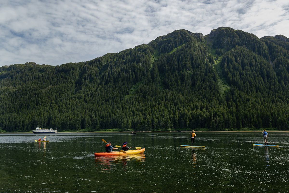 After a steamy frothy espresso and some toe-touching with our wellness specialist, our blood was flowing properly, and we were ready for another day in the Great Land. Diners were joined for breakfast today by a humpback whale cow and calf engaged in restful “logging” activity, setting the stage for a serene morning sail. They turned out to be the first of many majestic M. Novaeangliae we would encounter, most being much more active. We soon found ourselves approaching Morris Reef, and surrounded by not one, but two groups of humpbacks engaged in cooperative bubble-net feeding behavior! We spent time with both pods, viewing and photographing many spectacular lunges, with up to nine of these leviathans’ gaping maws breaking the surface simultaneously and in tightly choreographed formation. Our Global Explorers were then given an opportunity to receive Zodiac driving lessons from our USCG-licensed captains. All souls returned. We continued into the storied seven-mile-long Sitkoh Bay. Here we hiked an old logging road; amongst towering Sitka spruce, frequent bear signs, black-tail deer, and banana slugs galore! Once the wind abated, we also had the opportunity to launch our kayaks and enjoy a leisurely paddle in the bay, with views of National Geographic Venture , bald eagles, and an early 1900s cannery sight. At the end of the day, the ship embraced our return with cocktails, charcuterie, and conversation. A typically highly succulent dinner was followed by a night-capping presentation on birds of the region from our resident ornithologist.