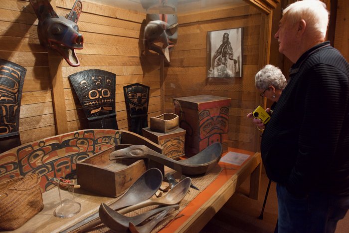Once the ship was tied up in the Cow Marina, there was a very short wait for Canadian Customs officials. Soon our vessel was cleared and we were all free to disembark for morning activities. Half of our group went for a short natural history walk along a local creek, while the other half went to the Museum of Northern British Columbia. The architecture of this museum is the first striking view as our group made their way a short distance from the dock into the small city of Prince Rupert. Built in the early 1980’s the idea at the time was to create a museum that would exemplify the First Nation’s style of Long House.