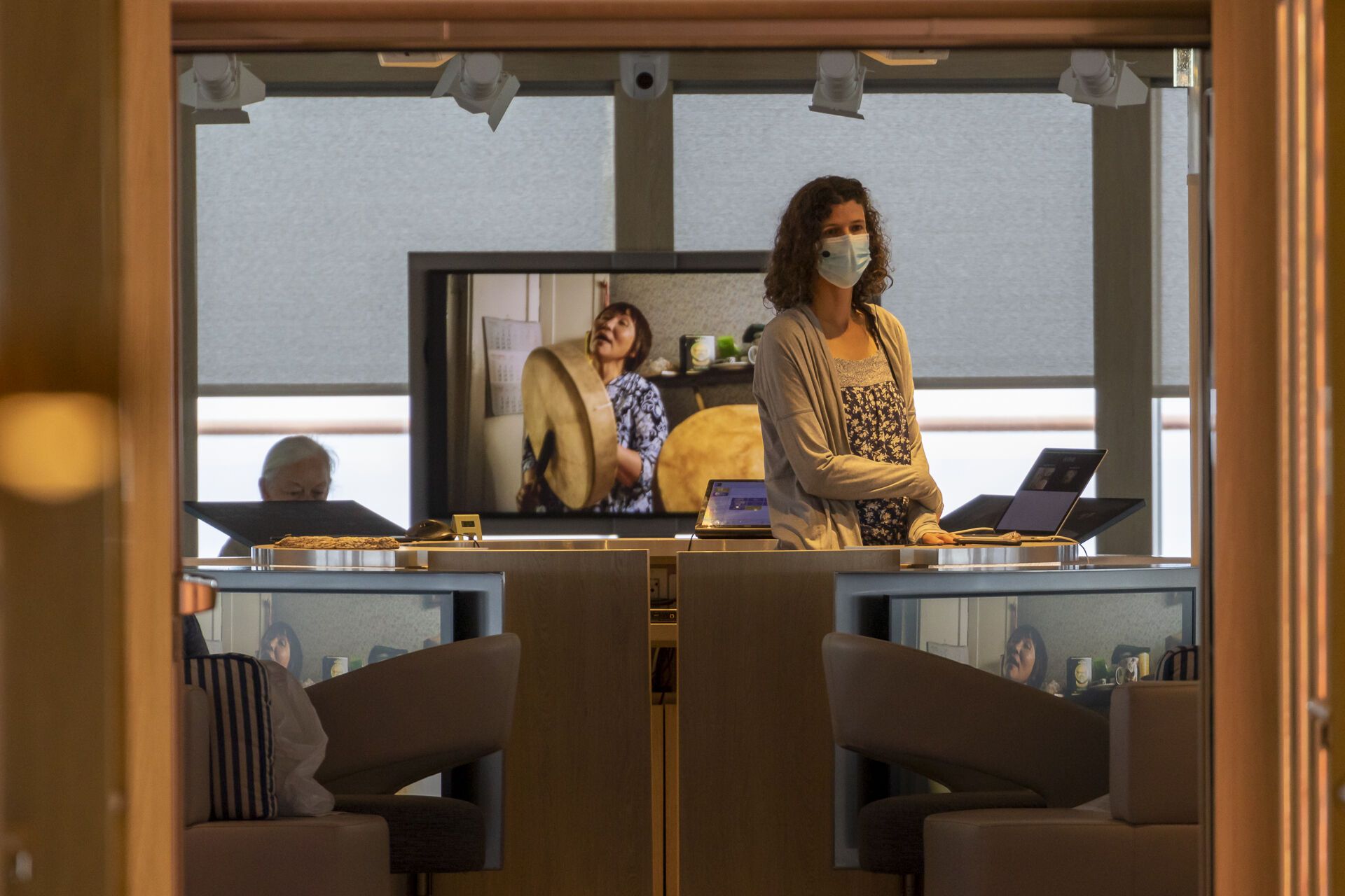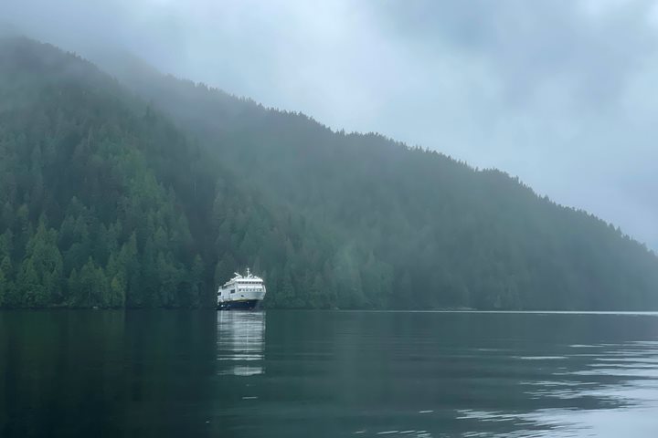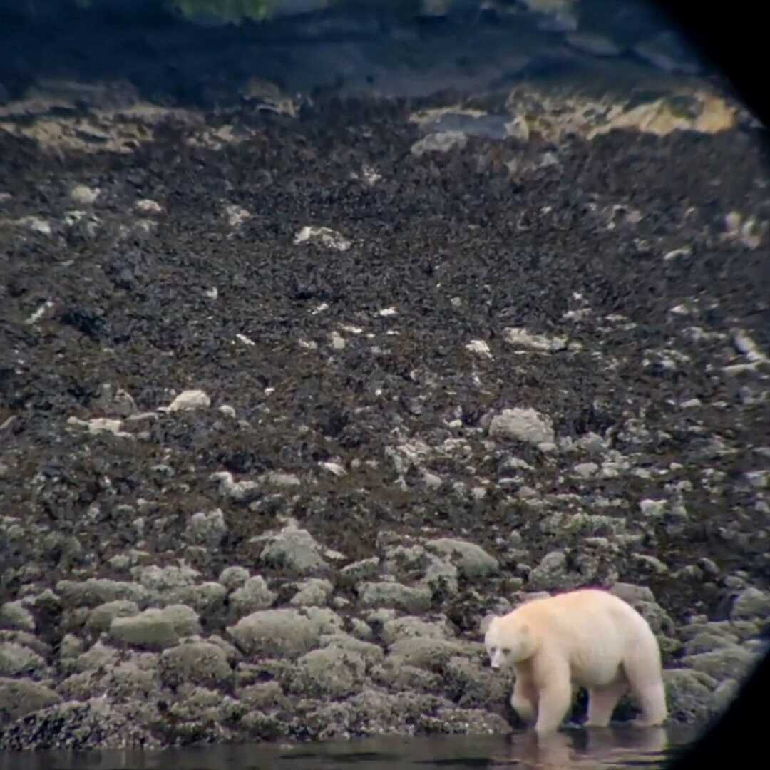 The early morning started off with dense fog obscuring the coastline, but as the sun continued to rise, the fog burned off and the conditions changed to an overcast sky and a slight drizzle. The coastline became clear and with a low tide, we suddenly had the perfect conditions for spotting wildlife. The past couple of days have already offered us wonderful wildlife viewing opportunities, including orcas chasing a Dall’s porpoise, spouting humpbacks, and a sighting of a spirit bear, also known as a white Kermode bear. Everyone was blown away by seeing one spirit bear, and it never crossed our minds that we might have the extraordinary luck to see a spirit bear twice! And yet, as we cruised along Princess Royal Island, a waterfall came into view, providing a perfect opportunity for a potential bear. Naturalist Jesse Humbert was on the spotting scope, prepared to spot another spirit bear! Two black Kermode bears were also quickly spotted, adding to the magical moment.