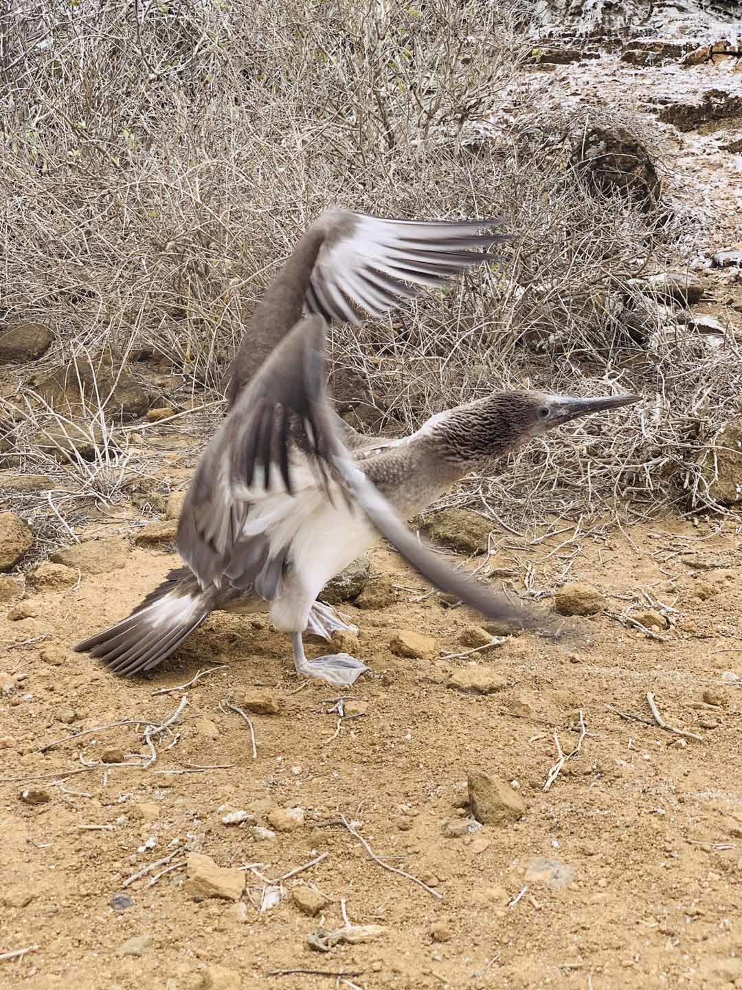 We just got into our Zodiacs, and the first thing that caught our eyes in the horizon was a blow of a majestic humpback whale! From a safe distance, we observed that was a mother and a calf having a relaxing time in the waters of Punta Pitt. After some time on the ocean, whale-watching and enjoying this very special moment, we had a wet landing at a sparkling green beach were sea lions rested. We continued with our hike through the eroded canons to reach a higher altitude, where the landscape of Punta Pitt left us amazed. Along this trail that looked barren and solitary, we met so much life and had incredible moments. First, we were entertained by a funny young blue-footed booby learning how to fly, meanwhile at the same time the neighboring blue-footed booby was being fed by his mother, and the challenging moment when she protected the food from the kleptoparasitic frigate bird was tense. We did not know where to look, all these fantastic actions, moments and emotions happening at once!