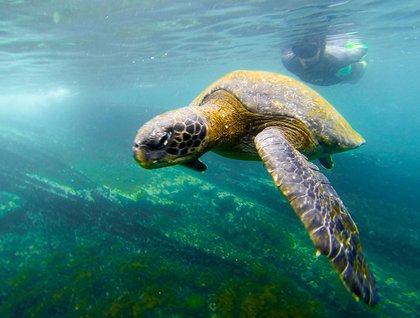 Once we got there, about 9:00 a.m. we jumped into the water. The visibility was spectacular, and the very first animal we saw were many sun fish. Everyone was excited about them, as they are hard to find and we saw many. Suddenly a school of mobulas passed below our feet, as well as tons of marine turtles, penguins, flightless cormorants, and multicolor fish. We stayed for about two hours because there is a lot to see here, and it’s pretty hard to find a place like this one and very hard to pass it over. It was just super!