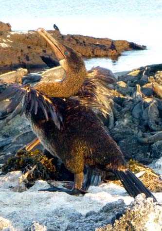 In the afternoon, we visited the youngest island in the Galápagos, Fernandina Island. The best preserved island in the archipelago, it is a favorite with naturalists. When we approached the visitors’ site at Punta Espinoza, there did not seem to be many signs of life. But as we got closer, we saw so many marine iguanas that we felt the place should be called Iguana Land. Fernandina has the highest concentration of iguanas of any visitors’ site in the Galápagos.