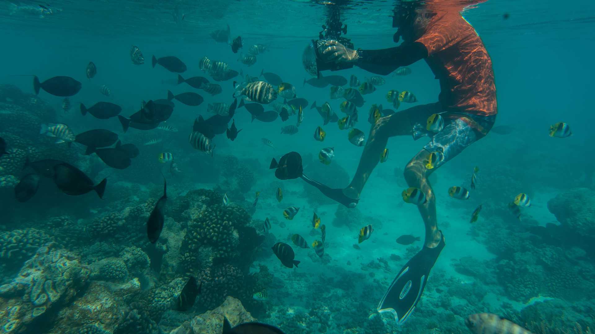 Photo caption: Undersea specialist Brett Garner photographs the diversity of fish at our afternoon snorkel location, "The Aquarium." Photo by Alex Krowiak