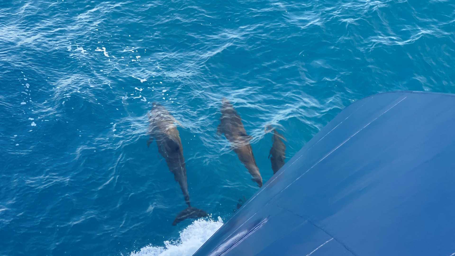 We reached Rangiroa early in the morning. It’s our first visit to a low-lying coral atoll, and this one is the largest in French Polynesia. The captain lined our ship up for an entrance into the lagoon through Tiputa Pass, which is known for its bow-riding dolphins. We waited on deck hoping they would come, and before long we saw them swim towards us: five bottlenose dolphins, including a young one. Usually, they will stay with a ship through the pass, but today this group stayed on our bow well into the lagoon. We think they must have enjoyed the ride in front of our X-bow.