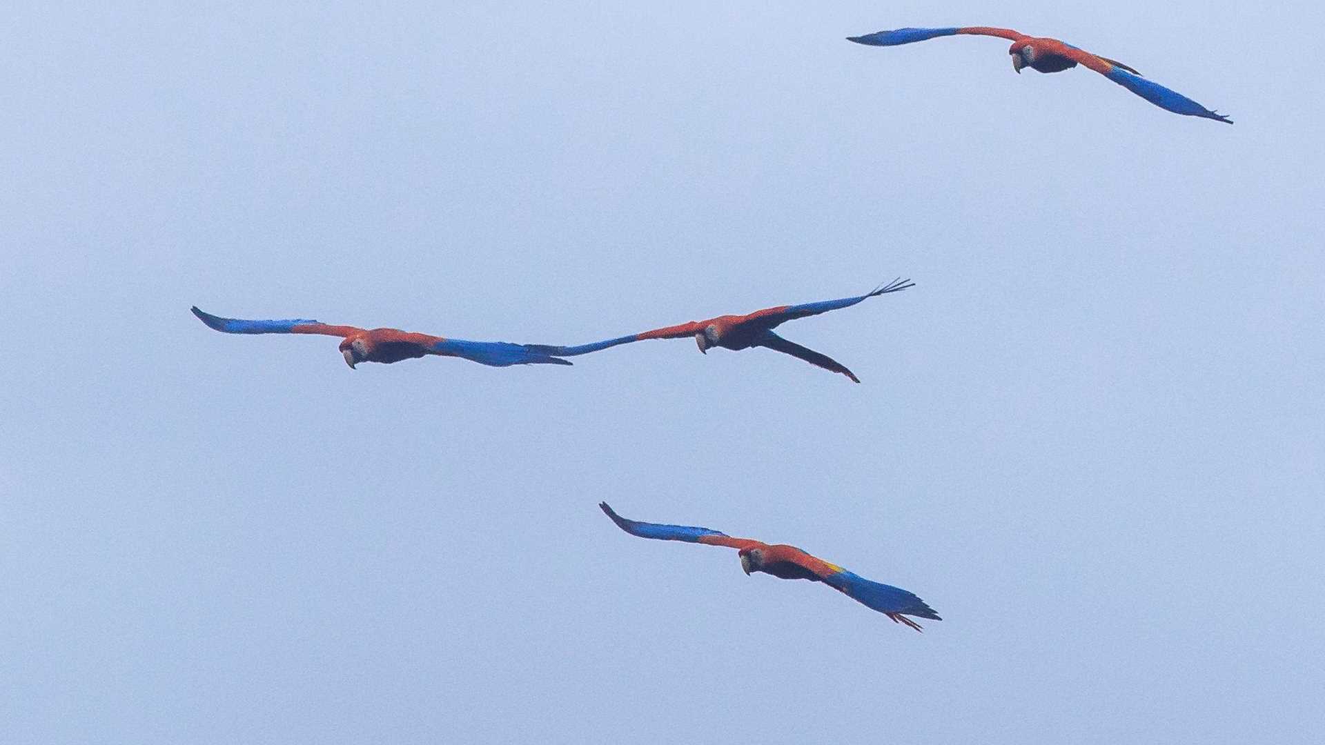 We hiked up the hillside through a lush tropical broadleaf forest to a small clearing overlooking the slopes. At first, we could only hear the “craaaakk” sounds as macaws flew over the forest. All of a sudden, as a pair of scarlet macaws flew across the valley, everyone aimed cameras and binoculars towards them. Pair by pair, they streamed through…18, 20, 24, 30, 42 and the numbers continued to grow! As the macaws landed on treetops and disappeared behind foliage, we continued to hear more and more as flock after flock arrived in the valley. Red, blue and yellow adorned the polewood trees for hours. Just when expedition leader Shaun sadly announced we had to leave and gave us the 10-minute warning, every macaw in the valley took flight and rose up with a crescendo of incredible sounds. Imagine the cacophony that hundreds of scarlet macaws taking to the skies would make!