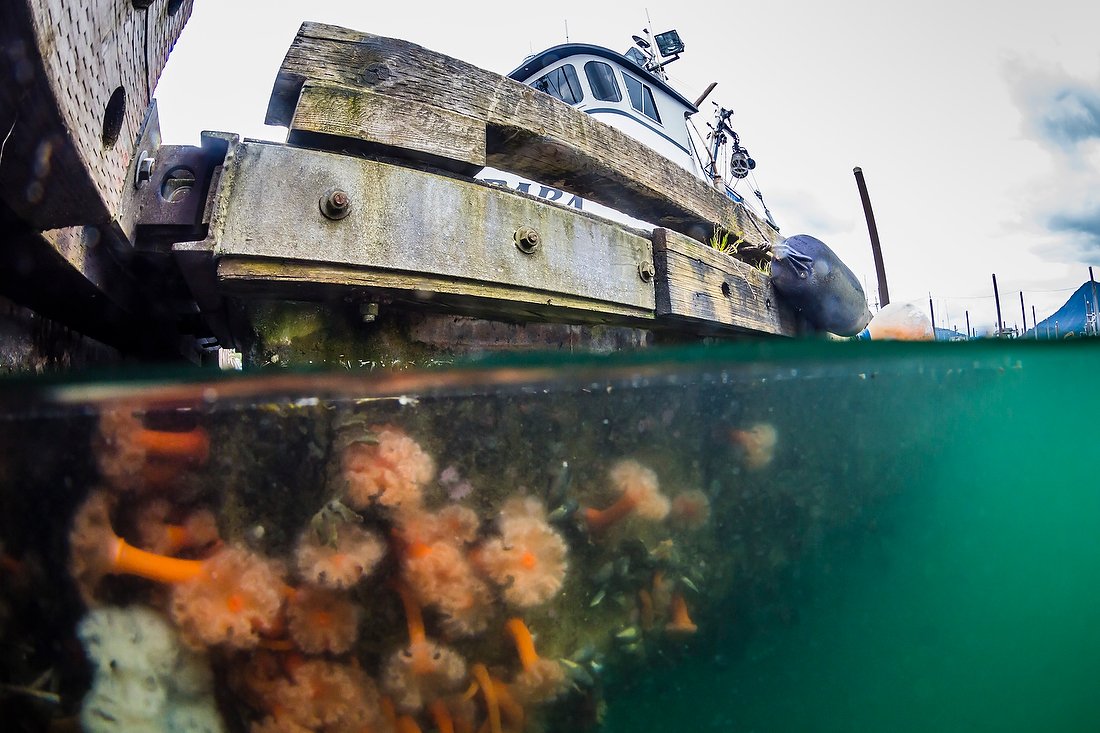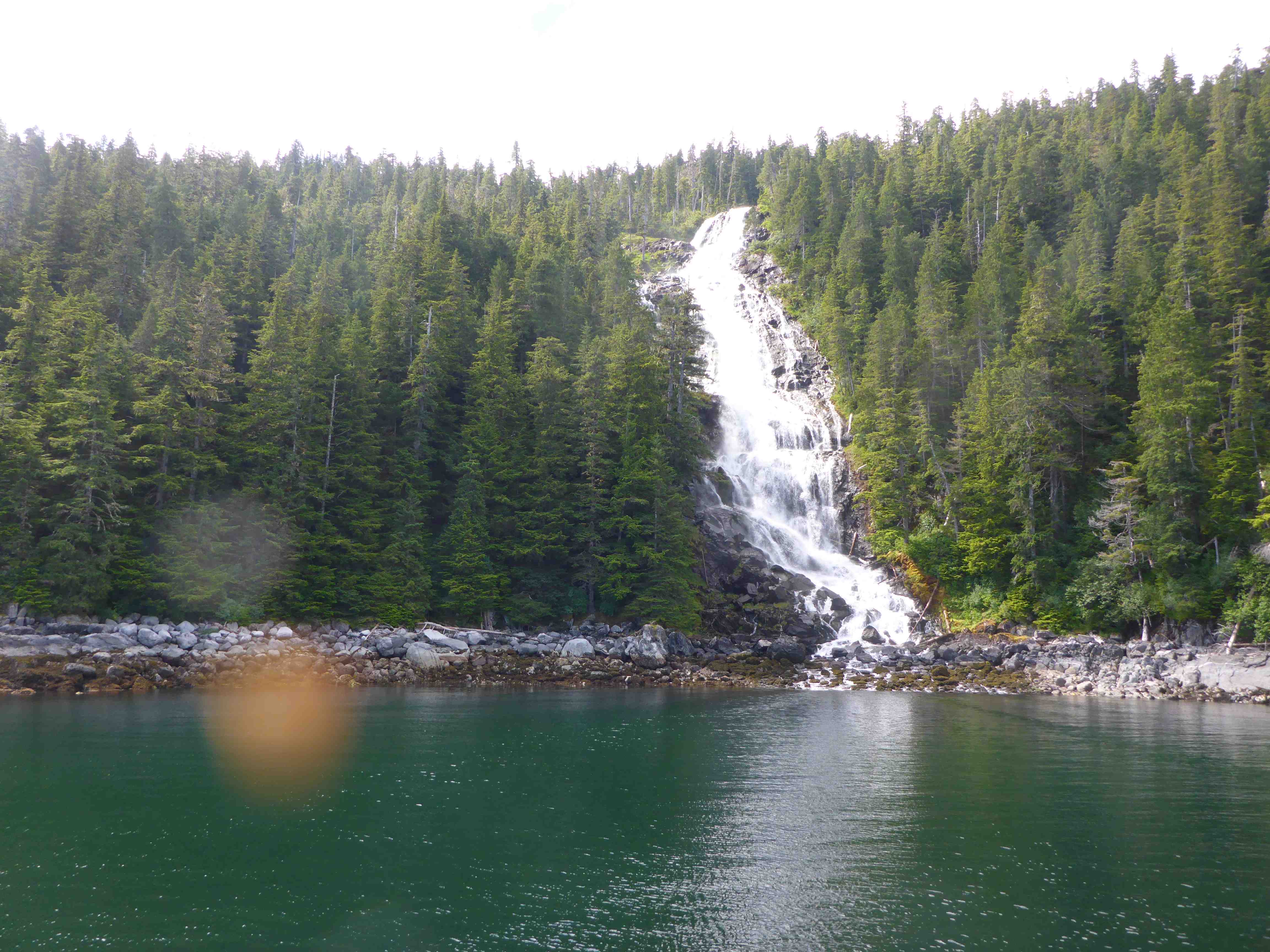 It made a fine prelude to our late-morning visit from Dr. Andy Szabo, director of the Alaska Whale Foundation, who spoke eloquently about the complexity and culture of this beautiful species. Just ahead was the narrow entrance to Red Bluff Bay, starkly heralded by the eponymous red bluff–barren rock surrounded by millions of acres of forest. The ultramafic rock, so rich in iron (hence the red color) and magnesium, creates poor soils and supports only meager plant growth. Inside the bay though, life could not have been richer, and we approached and admired a waterfall pouring down the mountainside.