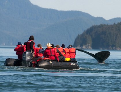 As the sun began to set, we were cruising north back in Chatham Strait, on our way to tomorrow’s destination. The high peaks lit with alpenglow and the glassy sea reflected the pinkish hues. Our grand finale was a single humpback whale bubble-net feeding over and over in the fading light. Spectacular!