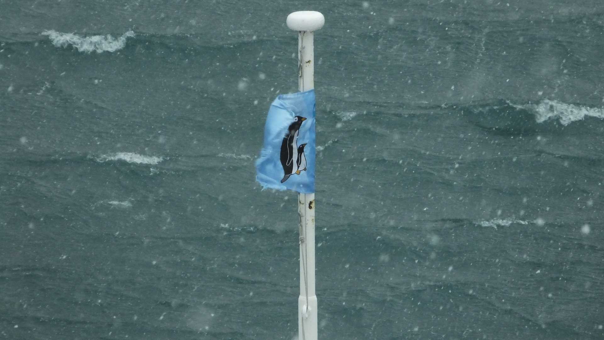 Today started early as National Geographic Explorer moved from its anchorage in Rosita Harbour to Right Whale Bay. The ship felt some of the force of the storm that is raging all around us, and we rolled into the bay hoping to find some shelter from the wind and make a landing. As the ship nudged its way slowly into the bay, it became obvious to all who were watching on the bridge, that this was not to be. The wind was blowing 35 knots straight out of the bay, with gusts of 50 knots from time to time. It was an impressive sight from the bridge, as the whitecaps were whipped from the top of waves, and the water in the waterfall on the edge of the bay was blown sideways in torn sheets of spray.