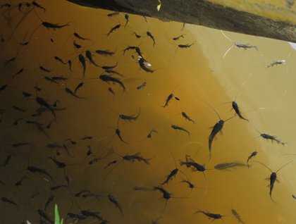 We made a short visit to the village of Urarinas for handicrafts.  Items made with seeds, shells, catfish fins, porcupine quills and lots of palm fibers were on display for our perusal and purchase.  A boat was being loaded while we were there with the local fish.  Packed in large wooden crates with ice, an oversized canoe was soon to be on its way to Iquitos with fresh fish caught along the Rio Zapote.