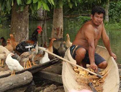 One resident was busy carving out a new canoe. He paused in his work to explain the process of burning, cutting and at the moment, he was thinning the walls using an adze. Colorful chickens as well as a couple of dogs surrounded him as he carved away on his stilted working platform.