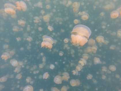 When you first slip into the almost too-warm waters and start to swim gently away from the dock off into the tranquil blue-green depths it’s a thrill to see a dozen of these glowing golden orbs floating under you. Then as you continue the density increases to hundreds, then thousands, then tens of thousands. The estimated total amount is around 15 million in a lake the slightly larger than a football field. The pulsating organisms range from all different sizes, thumbnails to a dinner plates, moving all different speeds, chaotic and yet coordinated at the same time. This mesmerizing display is enhanced by the vast quantity of jellies that aggregate in such numbers that it becomes hard to see the water through them. A truly unique experience to end a truly extraordinary expedition.