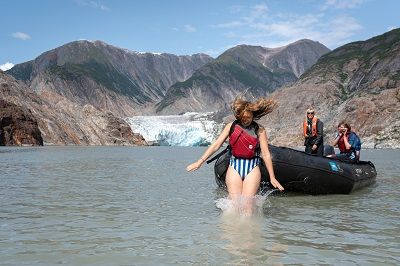 We continued with the theme of going with the flow into the evening, taking advantage of the perfect conditions to swap our traditional evening recap for an outdoor cocktail hour on the deck, enjoying the beautiful scenery. As we sailed past waterfalls and diving whales, the light lowered behind the elevation around us and cocktail hour turned to ethereal blue hour to wind down another magnificent day exploring Alaska’s coastal wilderness.