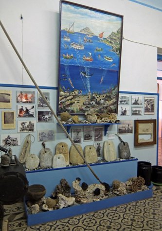 Captain Pushkarev anchored the ship outside the breakwater and took a Zodiac into the inner harbor to have a look at the wind and docking conditions. He then came back and sent the Zodiac back in to help with the mooring lines, as he skillfully brought the ship in toward the small jetty. The port anchor was dropped near the pier to pivot the ship alongside the dock, and the starboard rail snugged up to the dock and we were secure for the evening! Our guides Sophia and Effie gave us an improvised introduction to this active sponge-fishing harbor, and we even got the small nautical museum to open especially for us. It is very significant to our voyage because the marine archaeologists first recruited the sponge fishermen to look for amphoras, ingots of copper and tin, and other items of interest to locate ancient shipwreck sites that would later be excavated. Many of us ate dinner ashore at local tavernas or took a walk after dinner around the harbor, where Sea Cloud was unquestionably the talk of the island of Kalymnos for the entire night.