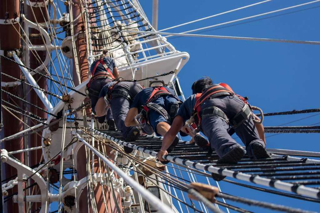 Captain Komakin called his sail plan to his bosun Mamikon, a junior officer who then coordinates the activities of the three mast teams. Each mast team is made up of six sailors, which include a mast captain for each mast, as well as the ship’s carpenter, metal fitter, sail-maker and twelve other able-bodied seamen and women. We were gathered on the spanker deck for the expedition leader’s explanations, as suddenly all the yardarms started to move in unison and we learned that the sailors were bracing the yards square for a downwind sail. Suddenly the rigging was alive with activity, as sailors scurried aloft up the ratlines, over the tops and out onto the yards to begin the setting of sails. With play-by-play descriptions of hauling sheets and clew lines, bunt lines and halyards, stays and shrouds and baggywrinkles, the ship blossomed into a gorgeous symphony of billowing white sails and a proud bowsprit pointing toward the horizon ahead.