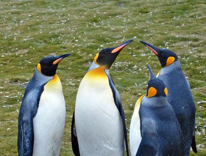 We began at 5:00 a.m. as we boarded our Zodiacs at first light to land at Salisbury Plain, in the Bay of Isles. It supports the second largest colony of king penguins on South Georgia, with about 60,000 breeding pairs at last count. King penguins have a unique breeding system. The large, brown, furry-looking young that we call “Oakum Boys” were gathered in crèches in the center of the colony. They started as eggs that hatched last summer. They have already survived a South Georgia winter, with their parents making only occasional visits to bring food. A few more feeding visits and the young will be ready to take on their adult-type plumage. Now, they vigorously flap their developing flippers and utter their plaintive whistles, each of them unique, that the parent birds will use to find their own young in the melee. Around the periphery of the colony were groups of molting adults, doing pretty much nothing as new feathers replaced the old. Following their molt, they will lay this year's egg. Finally, groups of courting adults pranced about, chest out, stretching as tall as they might, and occasionally whacking the others with their hard flippers.