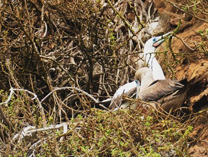 Punta Pitt also has impressive scenery from up above – here we saw red-footed boobies. Today we were lucky to see many, in particular a pair who were building their nest. The male took turns bringing branches while the female arranges it for the new baby soon to arrive. All our senses became aware as we listen to our surroundings. Soon afterwards we had beach time, with lots of big male sea lions among us, and afterwards our young explorers had their Zodiac driving lessons.
