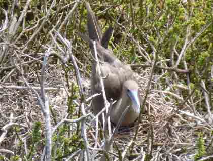 It was very sunny and windy when we finally arrived to the red footed boobies nesting area. We observed many of them making their nests, collecting some twigs which they cut from trees and bushes. One of them was incubating its egg, while on the other side of the cliff a couple was mating on a perfect conical nest. Downhill we observed another nest where a beautiful chick showed us its fluffy white feathers which contrasted with its black bill and legs. Far away from the ocean some marine iguanas were covered in dust while busy digging holes. They were making their nests, leaving burrows and footprints along the trail.