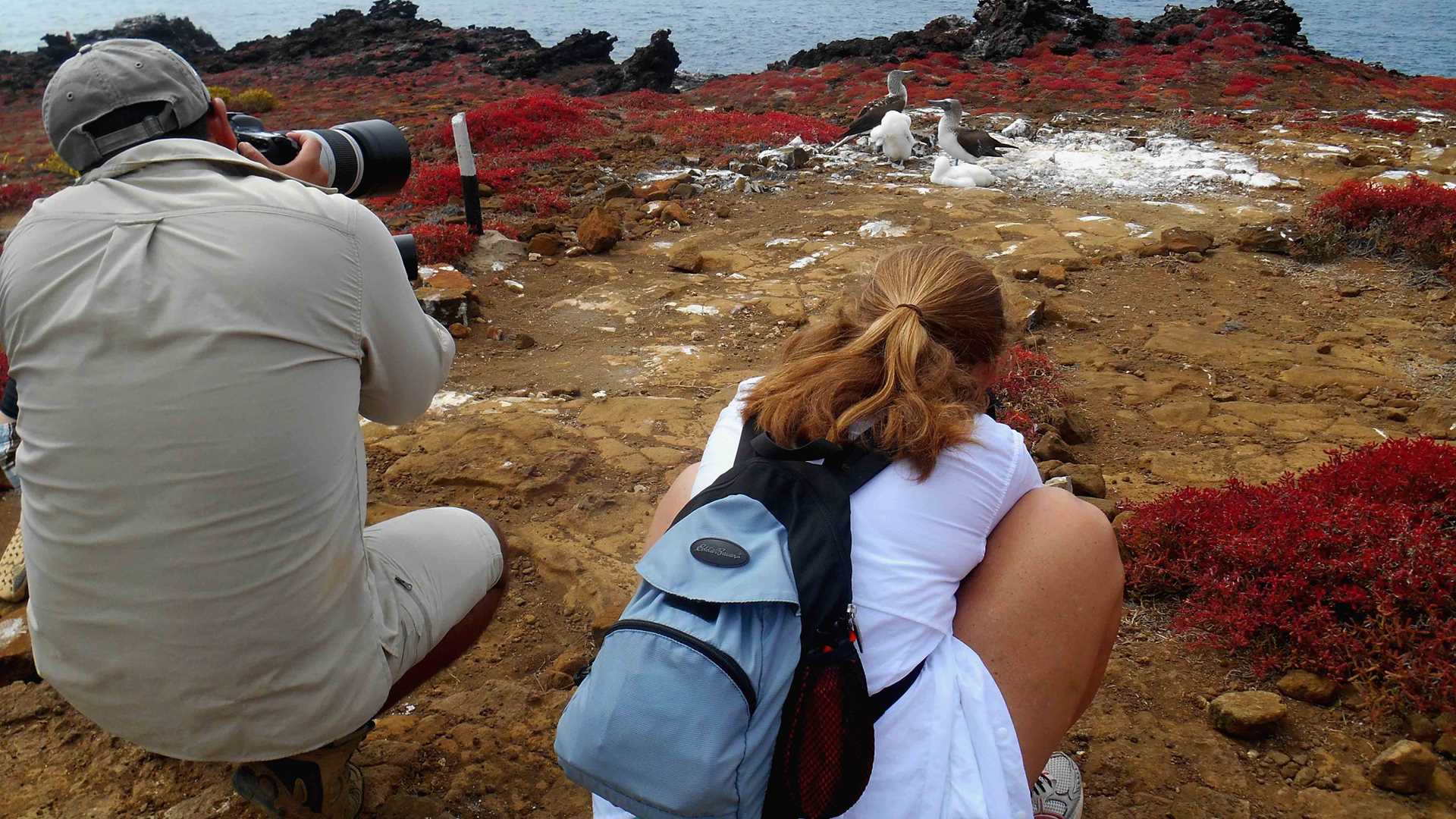 Early in the morning, we visited Punta Pitt, an astonishing walk which goes along a dry stream bed and then leads up towards a gorgeous plateau with several viewpoints. This site is the only place in the Galapagos where we are able to witness the three different species of boobies: the blue-footed booby, the Nazca booby and the red-footed booby. During the last years, the number of red-footed boobies and blue-footed boobies in this site has increased. This is the result of the constant efforts of the Galapagos National Park to control introduced species on the islands, such as cats and rats. We witnessed several nests with healthy chicks and caring parents, demonstrating that this ecosystem is healthy and thriving. With the contribution of responsible visitors to the Galapagos, we can improve this kind of positive result and hopefully eradicate alien species from this site. Although this is our last day, the feeling of excitement and awe keeps growing every time we walk just a few feet from the nest of so many birds, which show such a unique fearlessness.