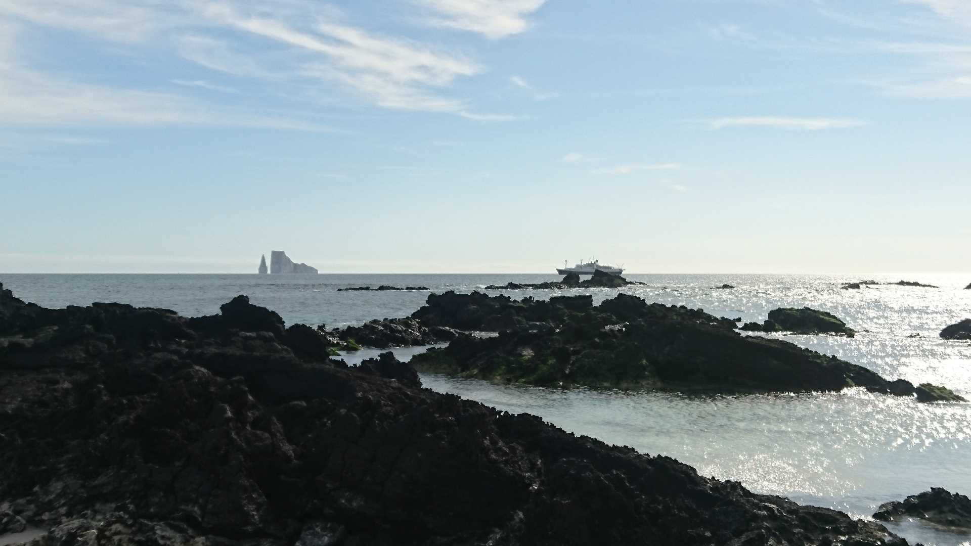 As the sun arose from the horizon, the peaks of Mount Pitt started to appear in the mist, and the swells surrounding the point drew a blurry white line outlining the beach at the foot of the hill. Right after breakfast our guests prepared for a coastal exploration on a beautiful volcanic beach covered with thin shards of eroded semi-precious stone (Peridot). Weather conditions could have not been better, with clear skies but a nice cool breeze that made a hiking really enjoyable.  The views from above were breathtaking, eroded ash cones topped with endemic vegetation, and we were able to spot several nesting sites of red-footed boobies and blue-footed boobies—to our surprise, we found several chicks of both kinds. On our way back to the beach we spotted the endemic lava lizard and the famous Chatham mockingbird. Once on the beach, our guests swam with sea lions and tropical fish, and our young explorers were offered the opportunity to take Zodiac-driving lessons.