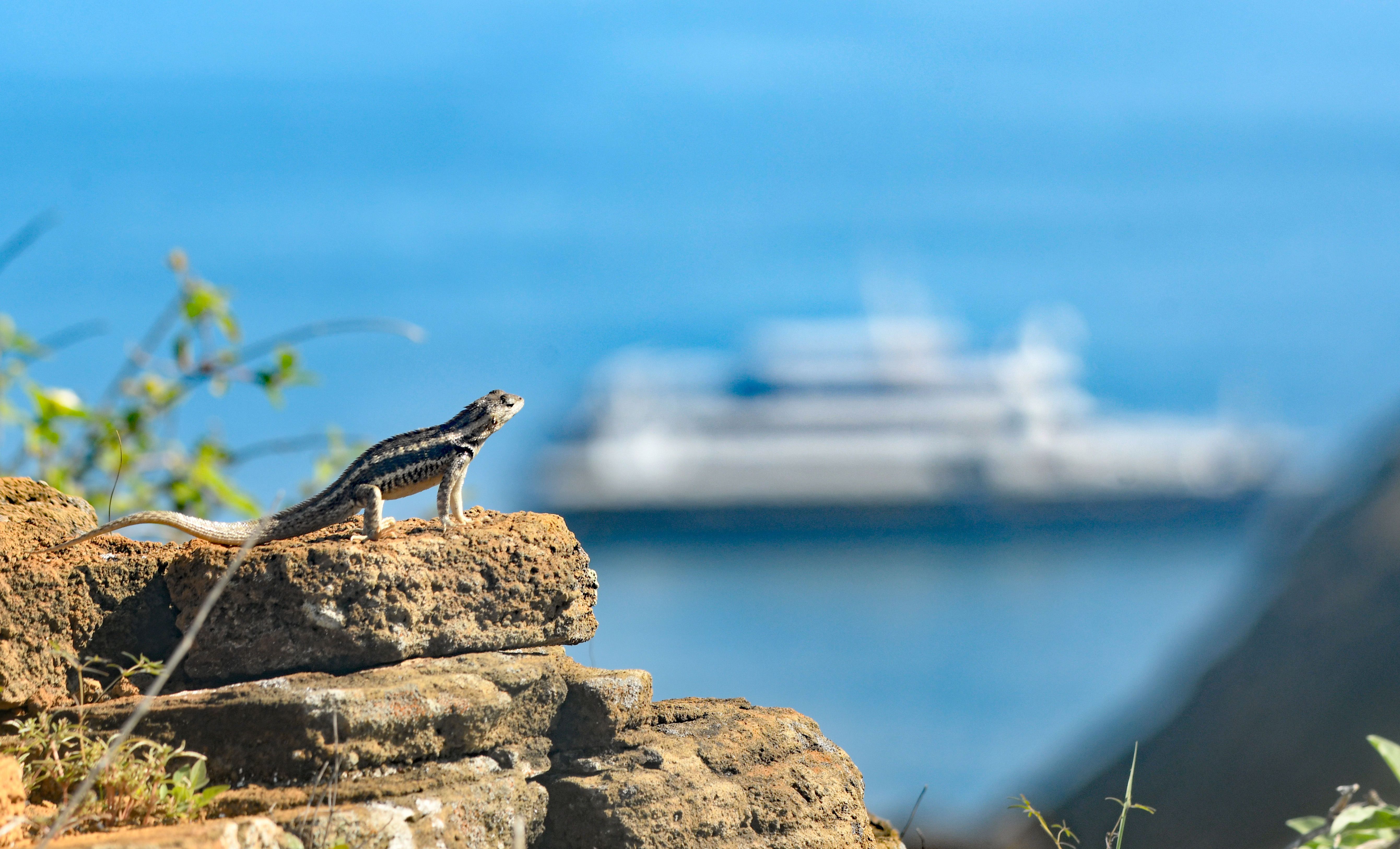 After breakfast, we landed on a green, sparkling beach, where the sand is made of olivine and micro pieces of quartz. There, we enjoyed our last hike. We were lucky to see the three species of boobies that exist in the archipelago–red, blue, and Nazca. The trail was steep, and after half an hour, we reached an area with a spectacular view of the place. The island of San Cristobal is one of the oldest in the Galapagos. The volcano located in Punta Pitt is a lot different than what we saw during the week. The volcano has many peaks, and you can tell erosion took place by the action of the rain, the wind, and the ocean. The day was very sunny and hot, but our reward came when we spotted endemic San Cristobal mockingbirds and endemic lava lizards, species unique to the island. The water was perfect to cool off after a very invigorating hike. Some sea lions were ready to play with our astonished guests. To swim and play with fearless and friendly sea lions is one of the most incredible experiences on a trip in Galapagos.
