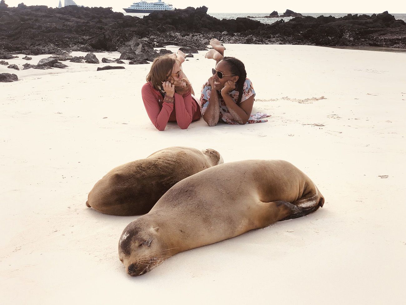 Later in the day, we embarked upon Cerro Brujo for our last outing with our amazing, passionate, and talented Naturalists. We cannot say enough about their presence and enhancement of our expedition. When they speak, you hang upon every word of wisdom and knowledge about the uniqueness and fragility of Galapagos. On Cerro Brujo, we enjoyed our last few words of wisdom from our naturalists and the powdery sand underneath our feet. At first, the sand on Cerro Brujo is more coarse and uninviting to your bare feet, but soon you encounter the transition zone where the effects of wind and water weathering and erosion are evident in the change from coarse grain to finely grained sand. The powdery sand was sprinkled with sea lions sunbathing in small groups. Our expedition family, yes, family, enjoyed time together on the white sand beach frolicking in the water, hiking to the end of the beachfront, and taking in the scenery together one last time.