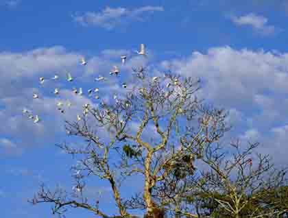 Large flocks of snow egrets covered the sky, creating a beautiful landscape. Here and there we stopped to see some of the more land-based birds that were hunting along the river banks. Hawks were some of the frequent sightings—some carrying fish, lizards, snails and even crabs, all of which are part of the daily diet of one of these dominant predators of the forest.