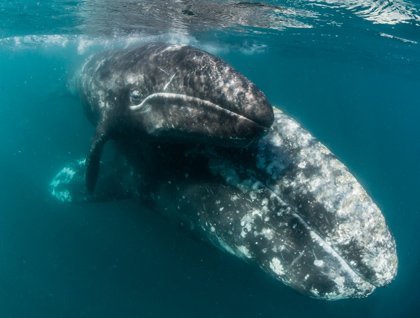 We find ourselves throughout the day surrounded by mothers and their two to three-month-old calves. As the tide changes moms exercise their young by swimming against the tide. The calves must be prepared for the 5,000 to 6,000 mile journey that lay ahead of them involving many threats and dangers such as sharks and killer whales. Most mothers have lost 30% or more of their body weight in producing both the calf and the fat-rich milk on which the calves have relied upon. Here in the lagoon food resources are minimal to non-existent and it is a whale’s fat that gets it through these lean times. Food-rich waters are still many weeks swim to the north, and mothers can only swim at the speed their calves can sustain.
